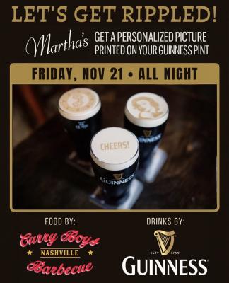 Kick off your weekend at Martha My Dear with an evening celebration on Friday, November 21 featuring a special Guinness Ripple machine to custom print guest photos right onto the beer foam. The Curry Boys BBQ crew will be onsite serving their tasty BBQ treats starting at 6 p.m. until sold out, so be sure to come early and come hungry. Expect a night full of good beer, food, and friends!