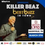 Celebrating the milestone of 10 seasons on Discovery Channel’s hit series, “Moonshiners”, comedian Killer Beaz is running the roads delivering his new “Best Buzz in Town” tour of outrageously funny standup comedy. This legendary comedian continues to make regular performances at The Grand Ole Opry, and is headed, loaded down with laughs, to Grand Ole Opry in Nashville, TN, Thursday, March 5th at 7:00 PM.