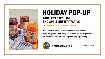 Shoppers will sample the Loveless Café’s blackberry, peach and strawberry preserves and apple butter, which will be available to purchase in the Museum Store. Free while supplies last.