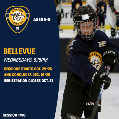 Little Preds Learn to Play is a low-cost opportunity for kids ages 4-9 to try the sport of hockey! This 6-week once per week session takes place on Wednesdays at 5:15pm. Classes run from Oct. 29-Dec.10 with registration closing Oct. 21.