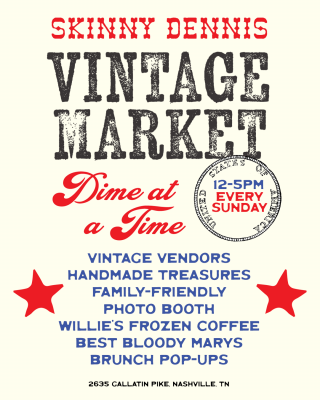 Each Sunday, live music venue and neighborhood bar Skinny Dennis hosts a vintage market on-site in partnership with A Dime at a Time. The local vintage shop offers top-shelf vintage and handmade items, bringing a rotating selection of new unique finds to the venue each week. This family-friendly event includes activities such as live music performances, the Skinny Dennis photo booth, brunch pop-ups, and more, while the adults can enjoy bloody mary cocktails and the fan-favorite bar classic, Willie’s Frozen Coffee.