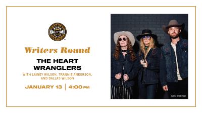 The museum will host a Writers Round with Lainey Wilson and her most consistent songwriting partners — Trannie Anderson and Dallas Wilson. During this program, the three friends — who call themselves the Heart Wranglers — will share the stage to perform some of the songs they have written together. The writing trio has earned Grammy, CMA and ACM nominations for their multi-platinum co-writes including the singles "Heart Like a Truck," "Somewhere Over Laredo," "Wildflowers and Wild Horses" and "Whirlwind," as well as 9 other songs released across Lainey’s albums. Trannie Anderson met Lainey shortly after Anderson moved to Nashville from Texas in 2015. In addition to songs recorded by Lainey, Trannie has written songs recorded by Dan + Shay, Ella Langley, Reba McEntire, Nate Smith, Cole Swindell, Morgan Wallen and other artists. Nashville native Dallas Wilson met both Lainey and Trannie in 2017. His songs have also been recorded by Ernest, Corey Kent, Meghan Patrick, Dylan Scott, Teddy Swims and Mitchell Tenpenny, among others.